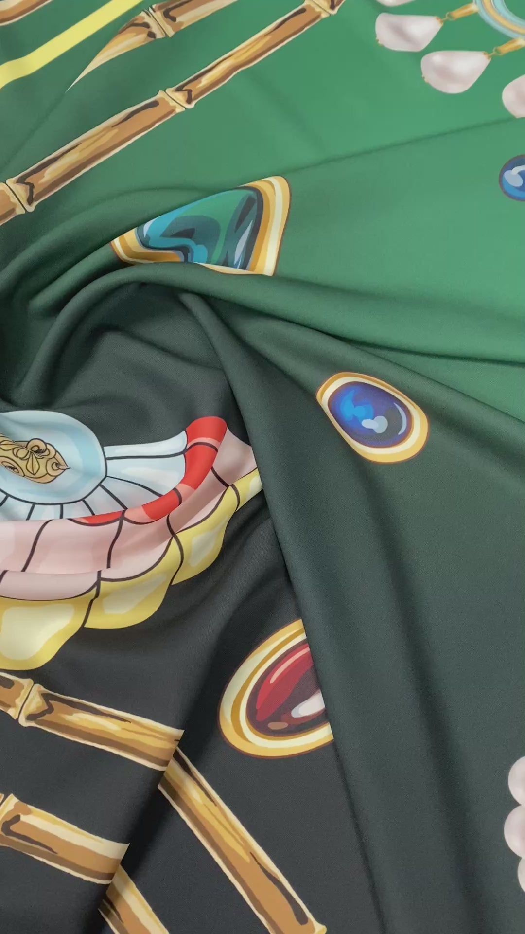 Jewellery Print Crepe Fabric by the Metre – Emerald Green Gold Motifs