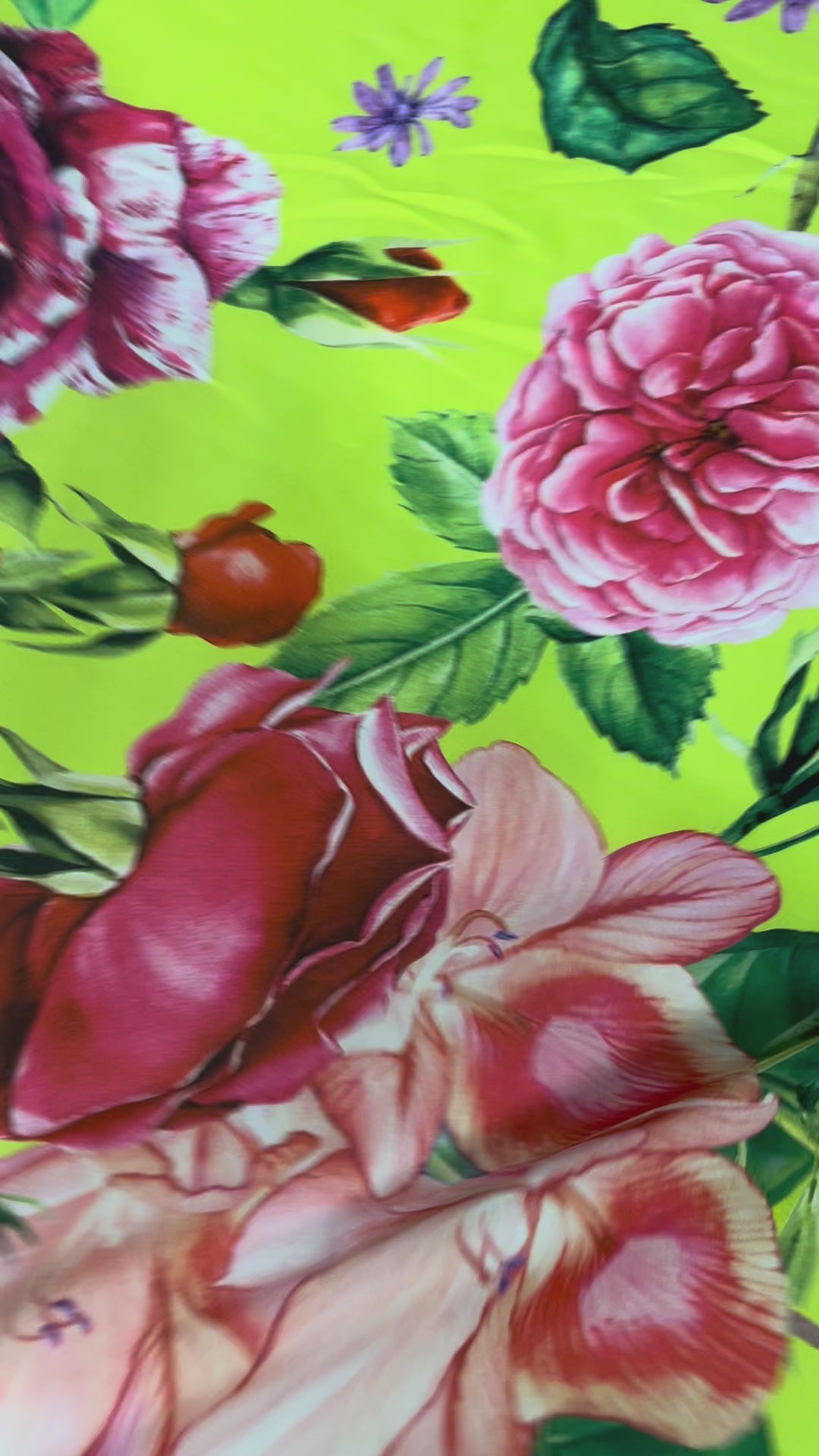 Vibrant lime green satin fabric with bold pink, red, and purple floral print. Ideal for statement dresses, blouses, and creative sewing projects.