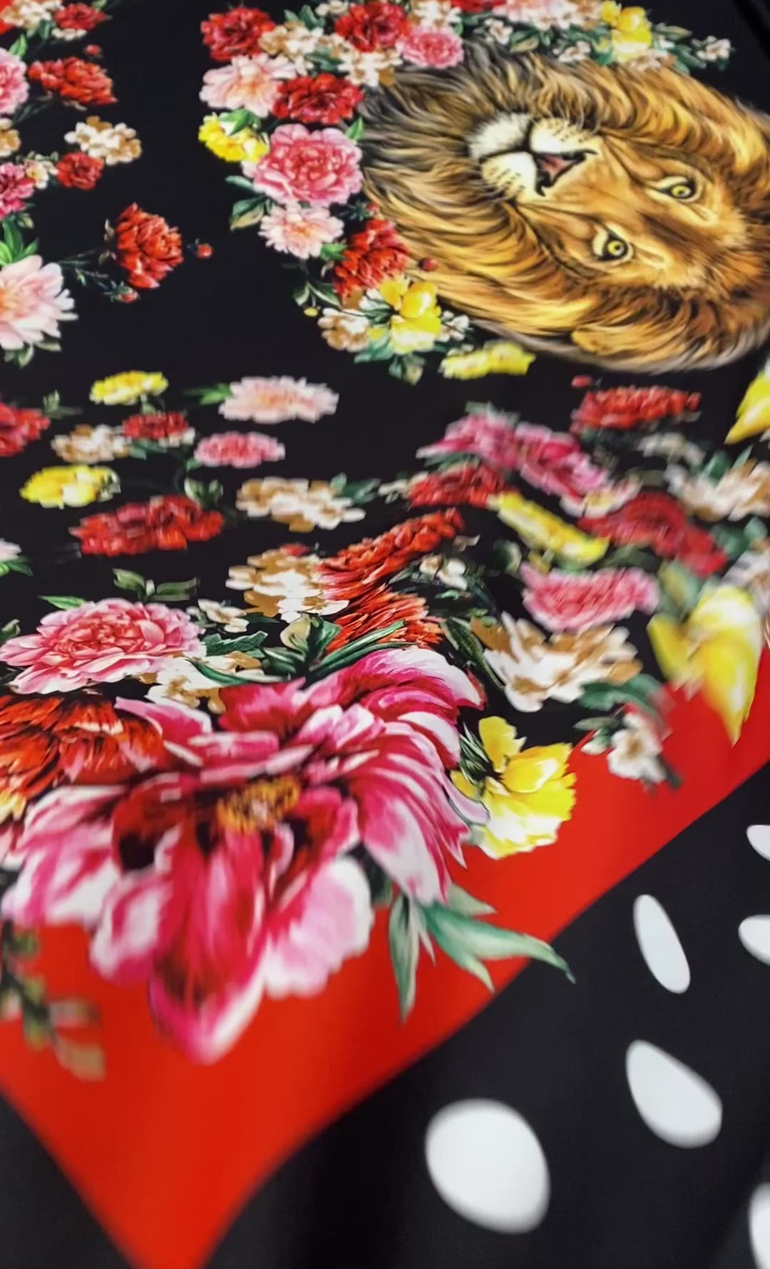 Bold lion & floral crepe fabric with black polka dot detail. Perfect for unique dresses, shirts, and statement fashion sewing.