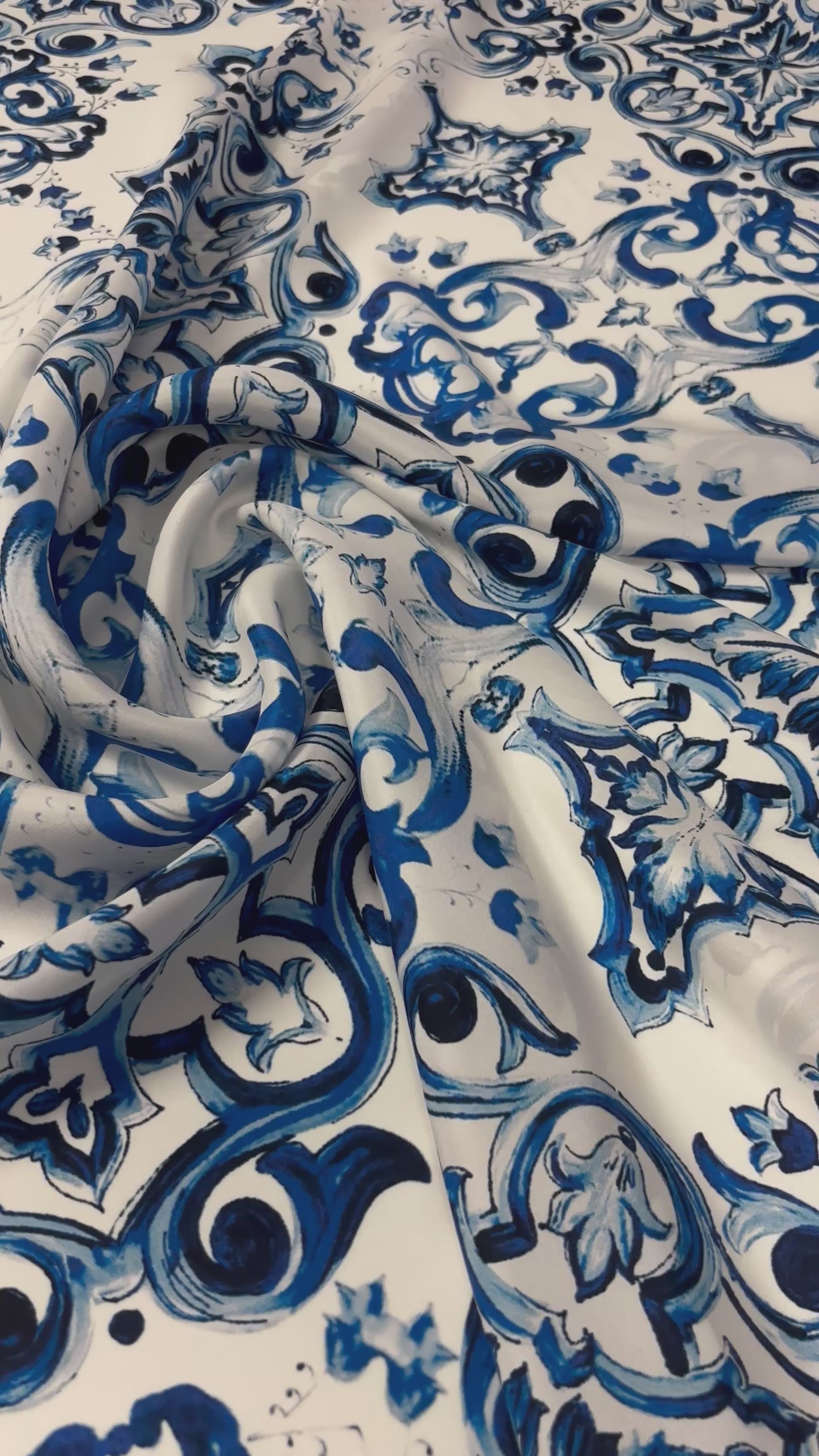Luxury Blue & White Chiffon Satin Fabric by the Metre – Baroque Tile Print