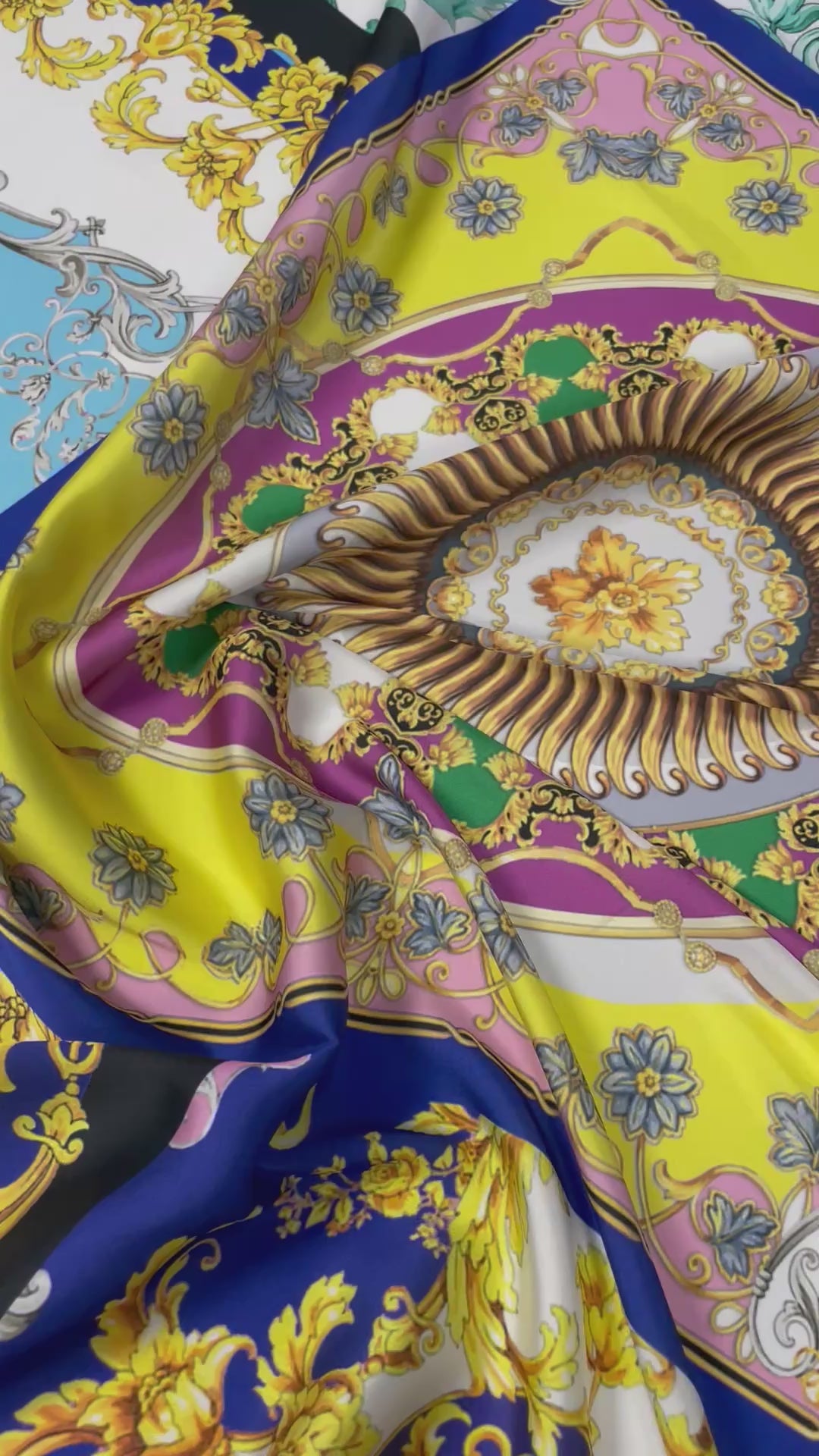 Luxurious satin fabric with vibrant multicolour baroque patterns. Perfect for bold dresses, statement blouses, scarves, or home décor projects.
