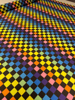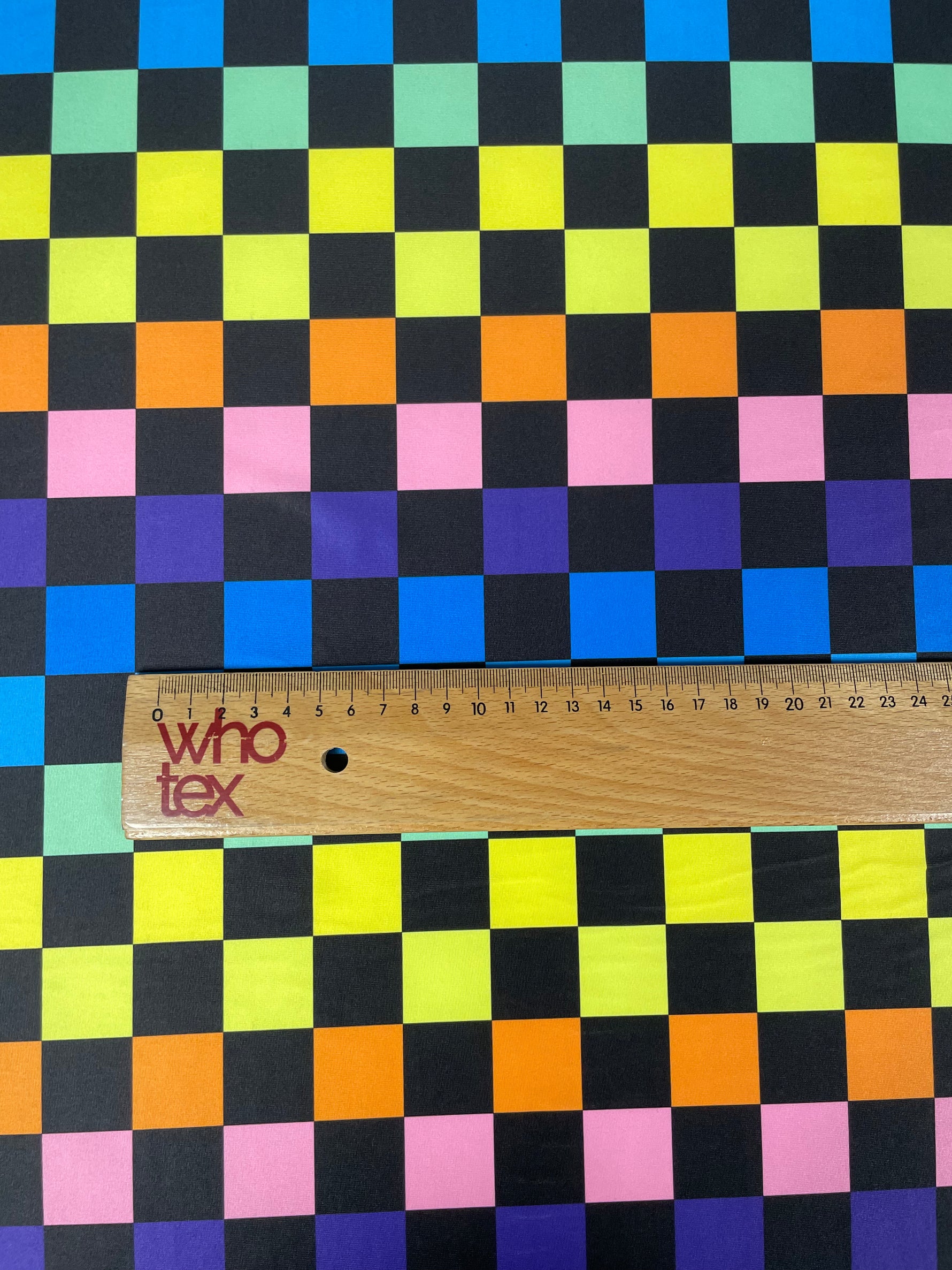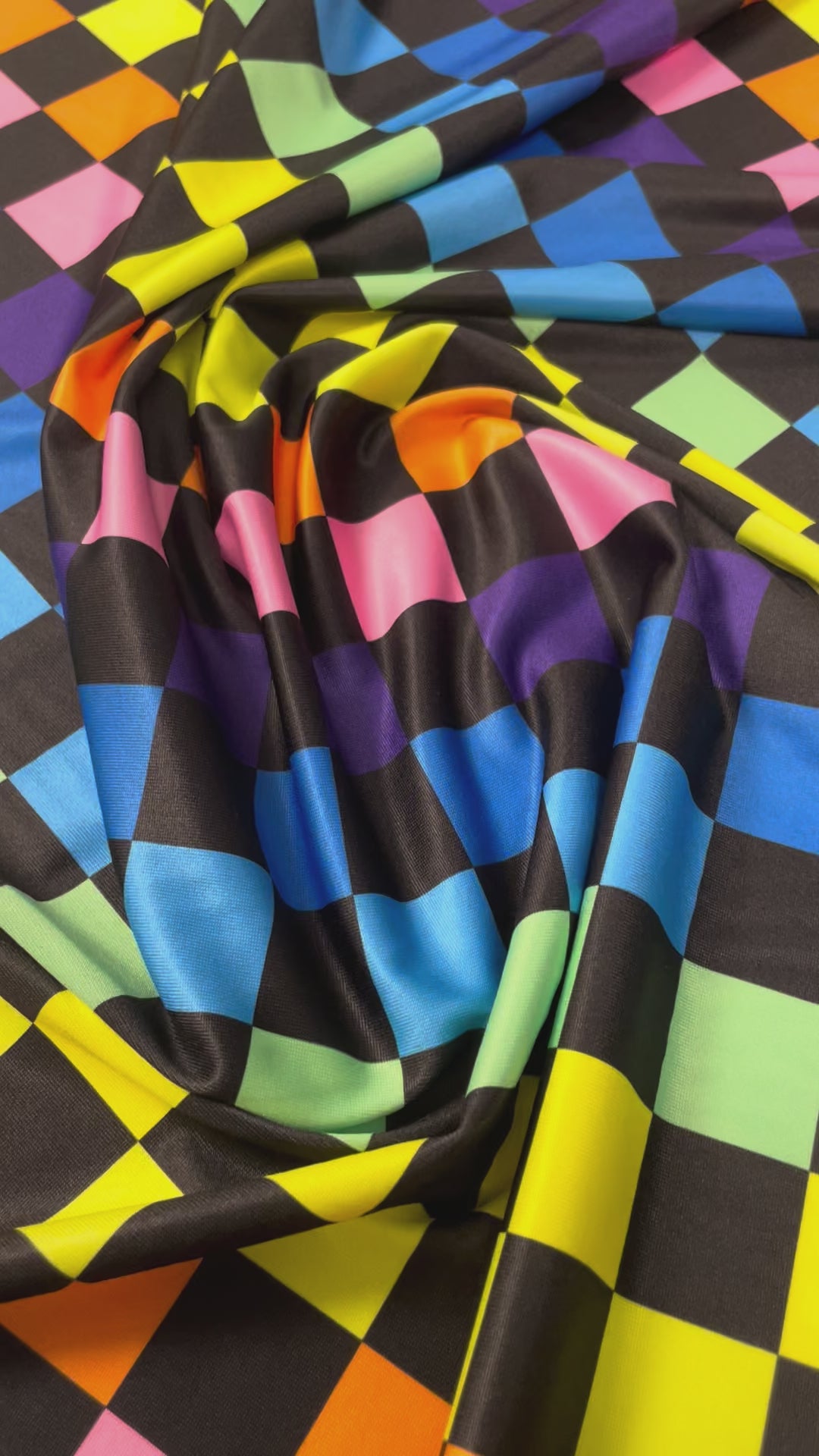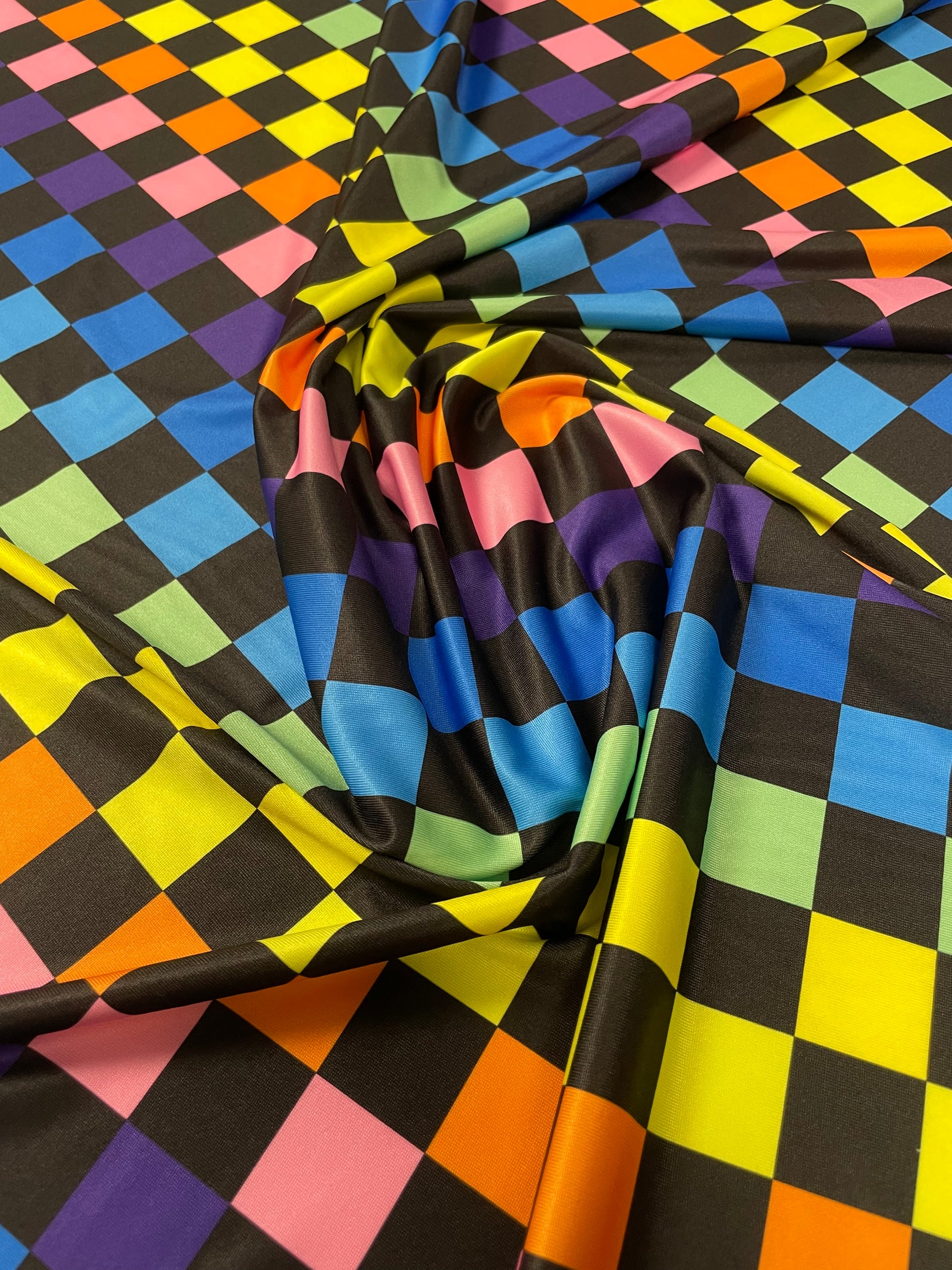 Vibrant multicolour checkered spandex fabric with stretch. Ideal for costumes, dancewear, fashion, and creative DIY projects. Sold by the metre.