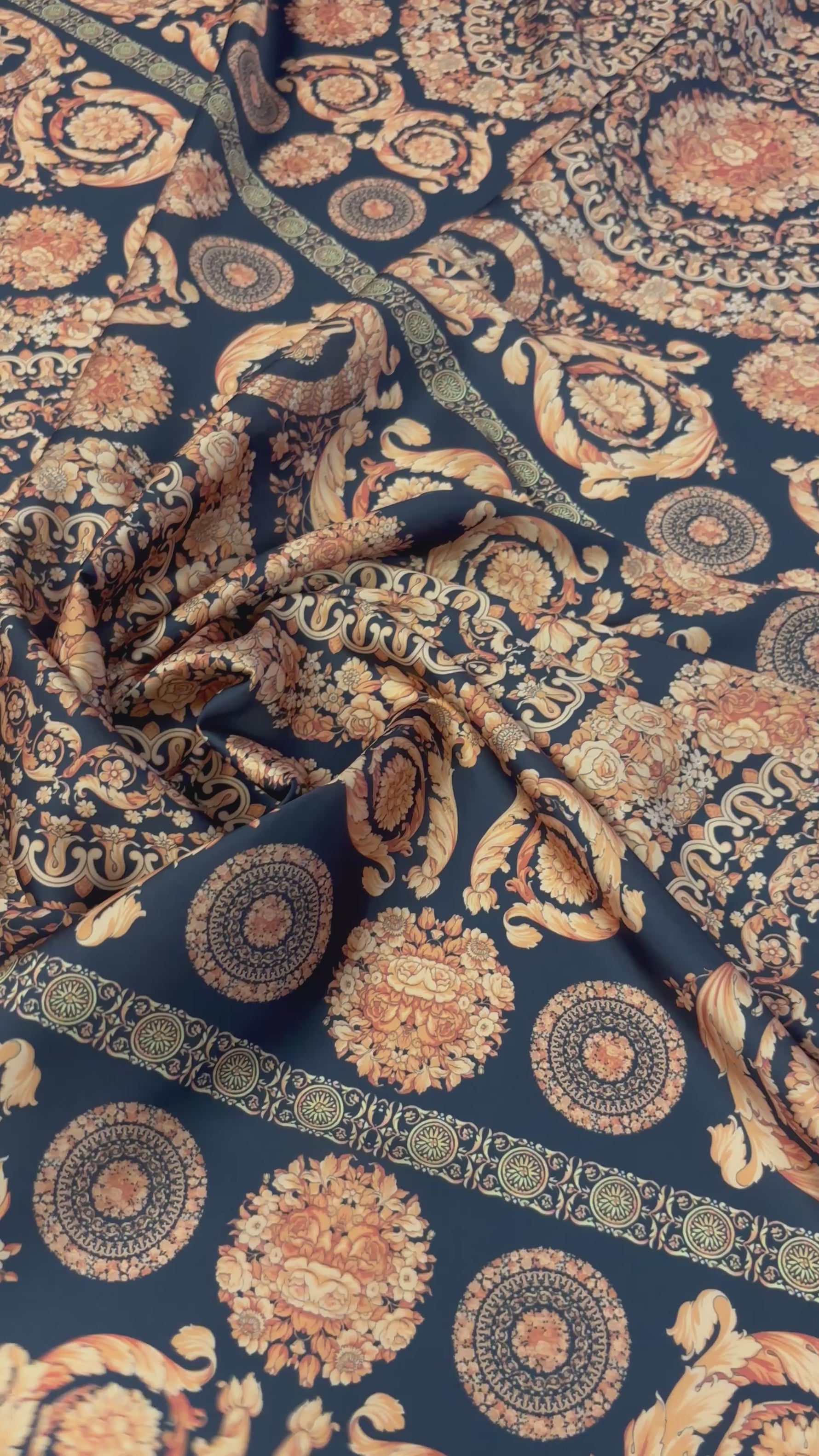 Navy Chiffon Satin Fabric by the Metre – Baroque Floral Medallion