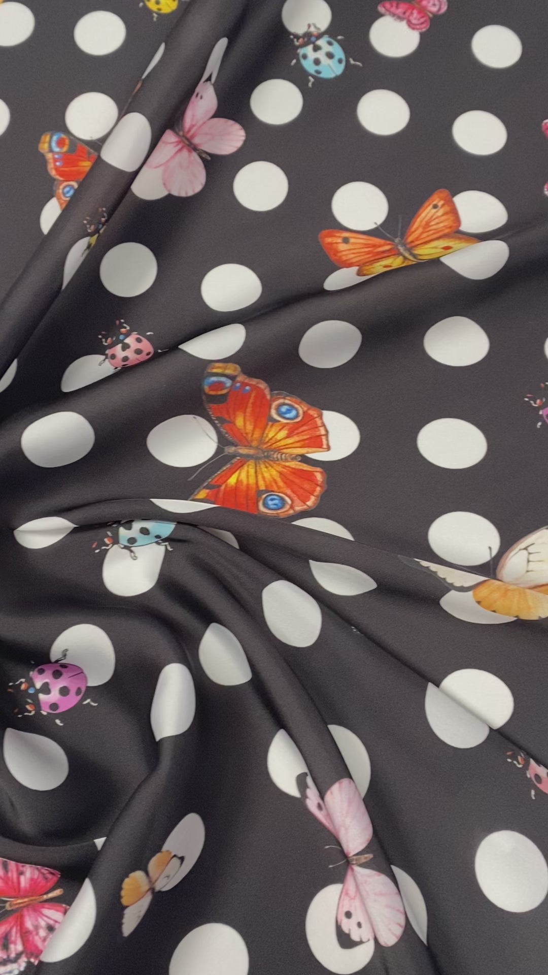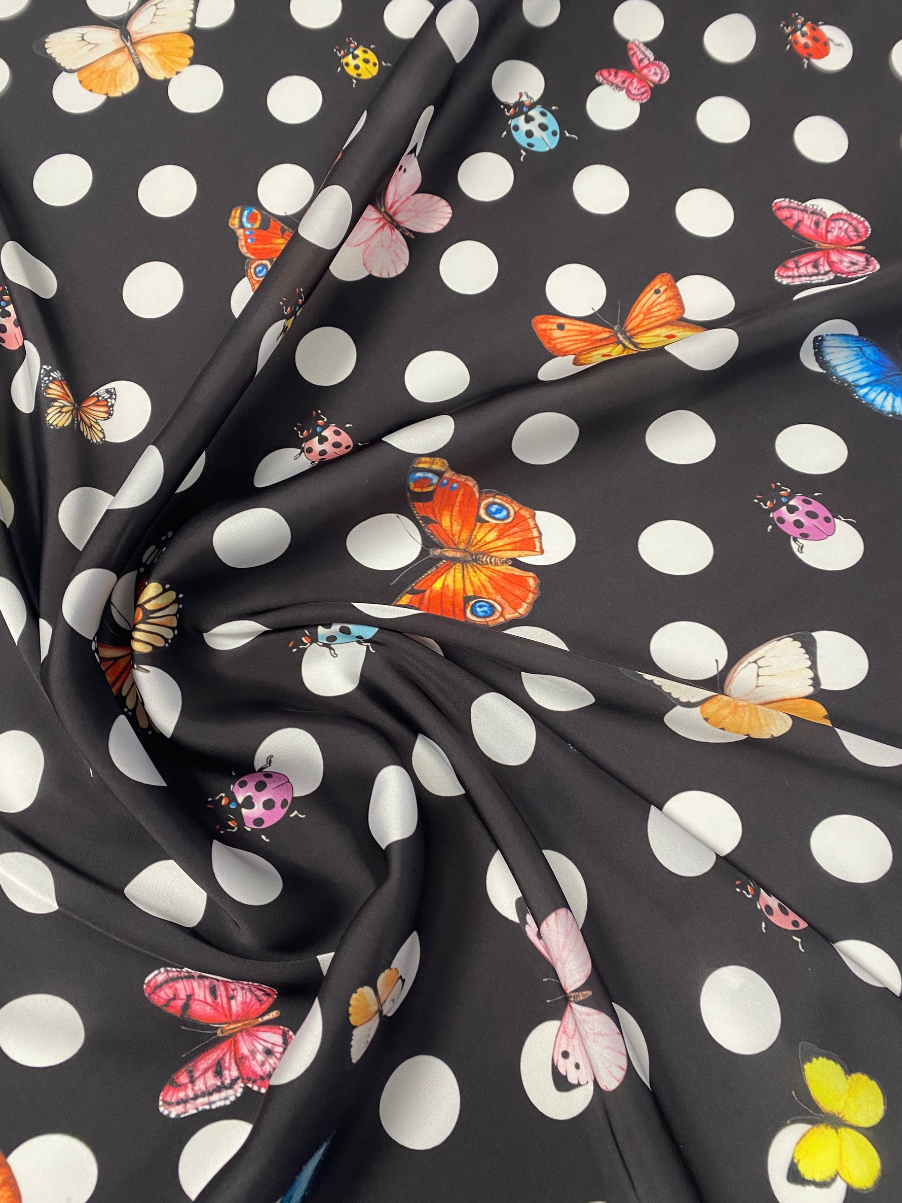 Shop chiffon satin fabric with polka dots, butterflies & ladybirds by the metre. Lightweight, silky & vibrant. Perfect for dresses, blouses & scarves.