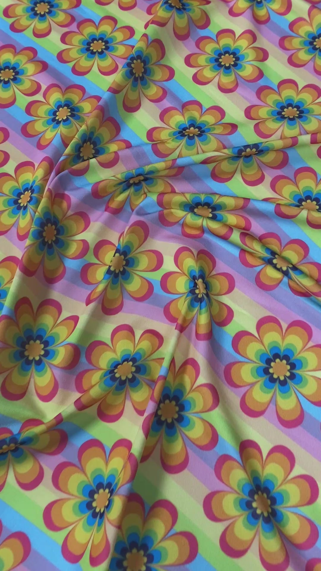 Bold retro fabric with rainbow stripes and vibrant flower motifs. Perfect for dresses, crafts, and décor projects. Sold by the metre for unique creations.