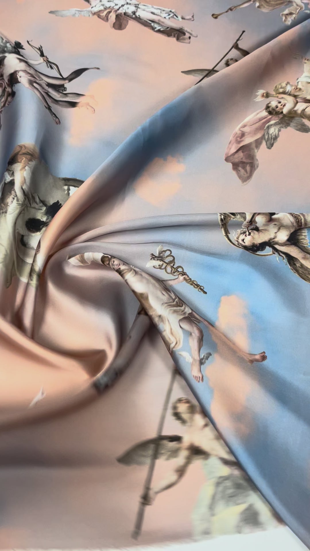 Artistic satin fabric featuring Renaissance-style angels on a cloudy sky background. Ideal for unique dresses, statement blouses, or creative sewing projects.