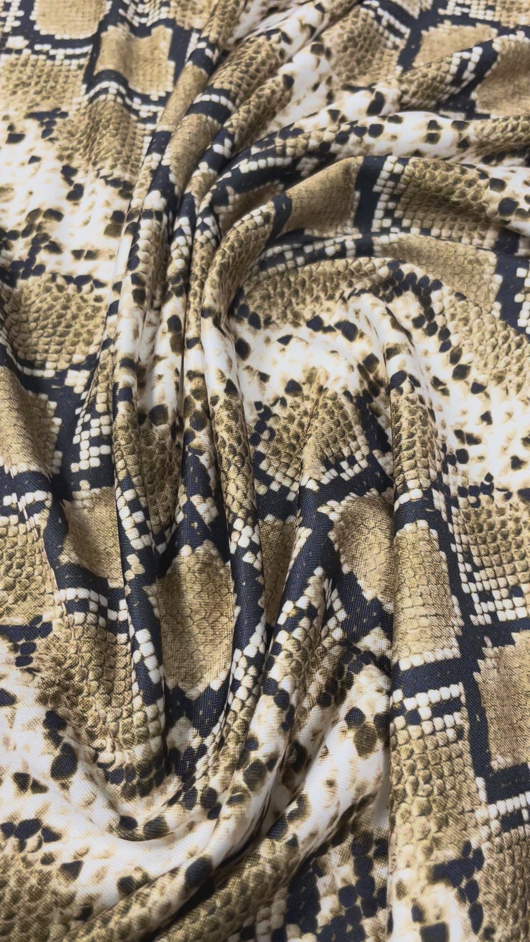 Stretch spandex fabric with stylish brown snake print design. Ideal for dresses, leggings, tops, costumes, and creative fashion projects. Sold by the metre.