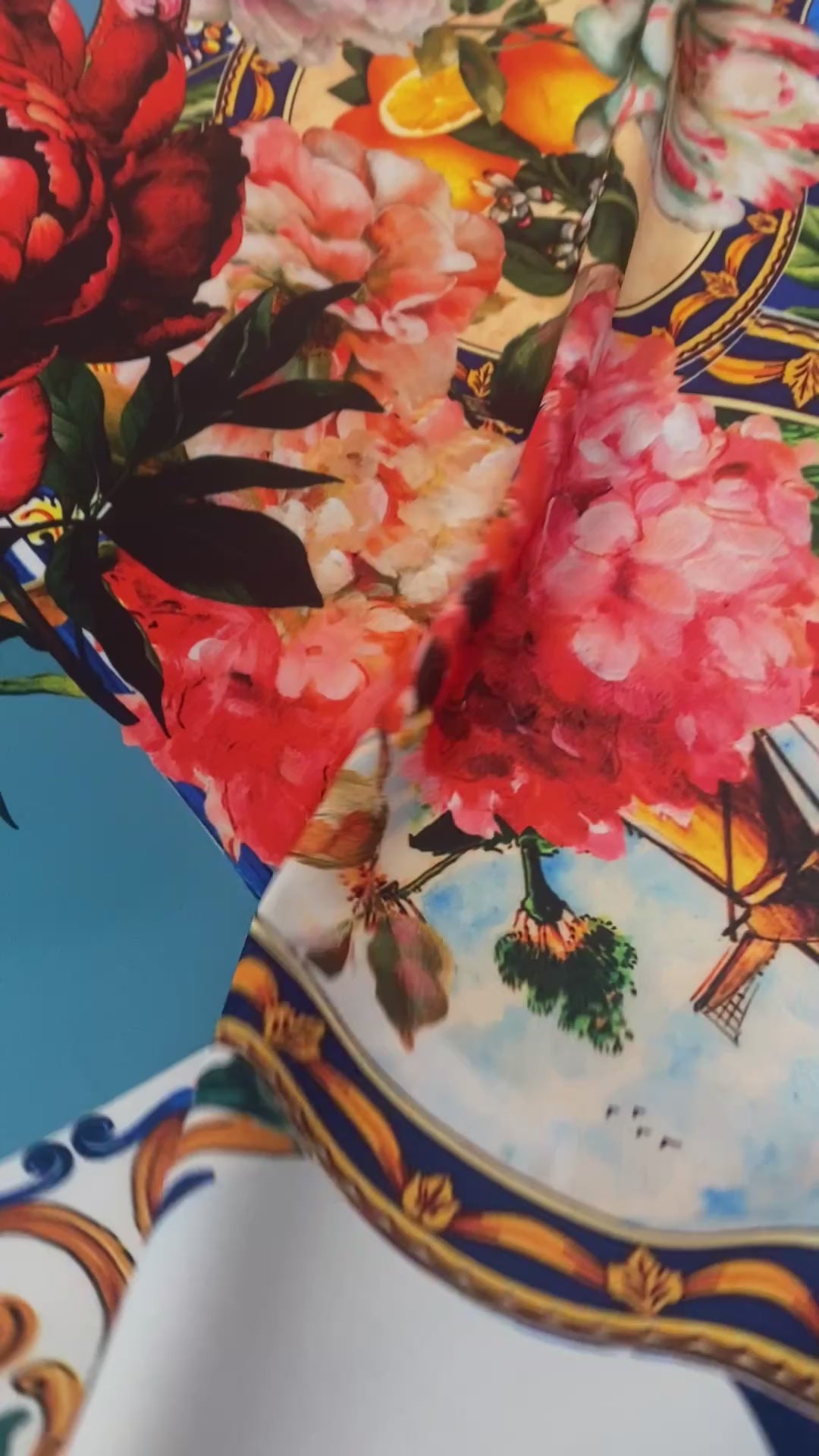 Bright crepe fabric with bold florals, citrus and Mediterranean tile design — perfect for dresses, blouses and statement pieces.