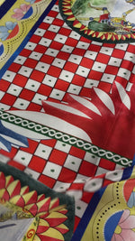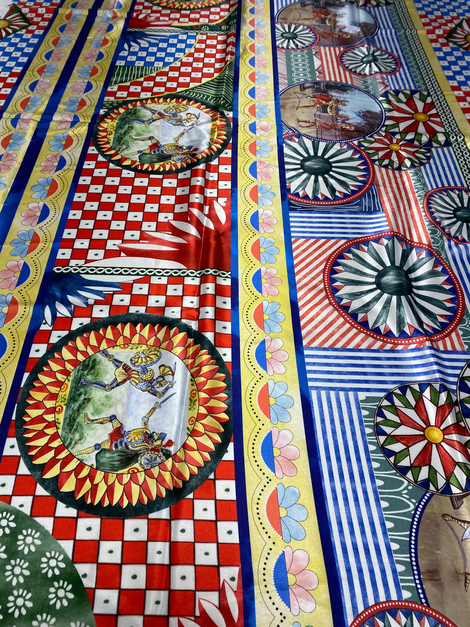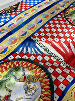 Luxury satin fabric with colourful geometric and artistic patterns. Smooth, glossy texture ideal for dresses, skirts, or elegant fashion projects.