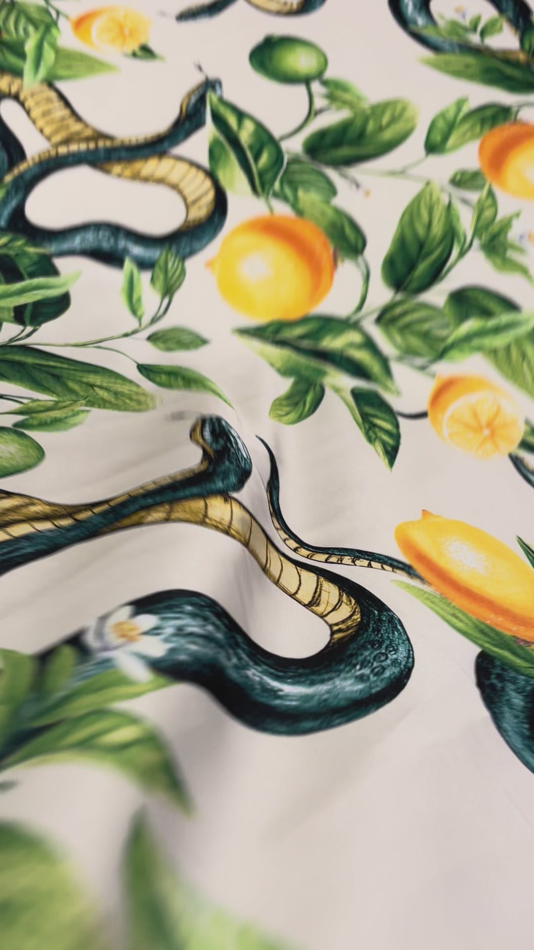 Elegant white satin fabric featuring snakes and citrus fruit print. Ideal for bold dresses, statement blouses, and luxury sewing projects.