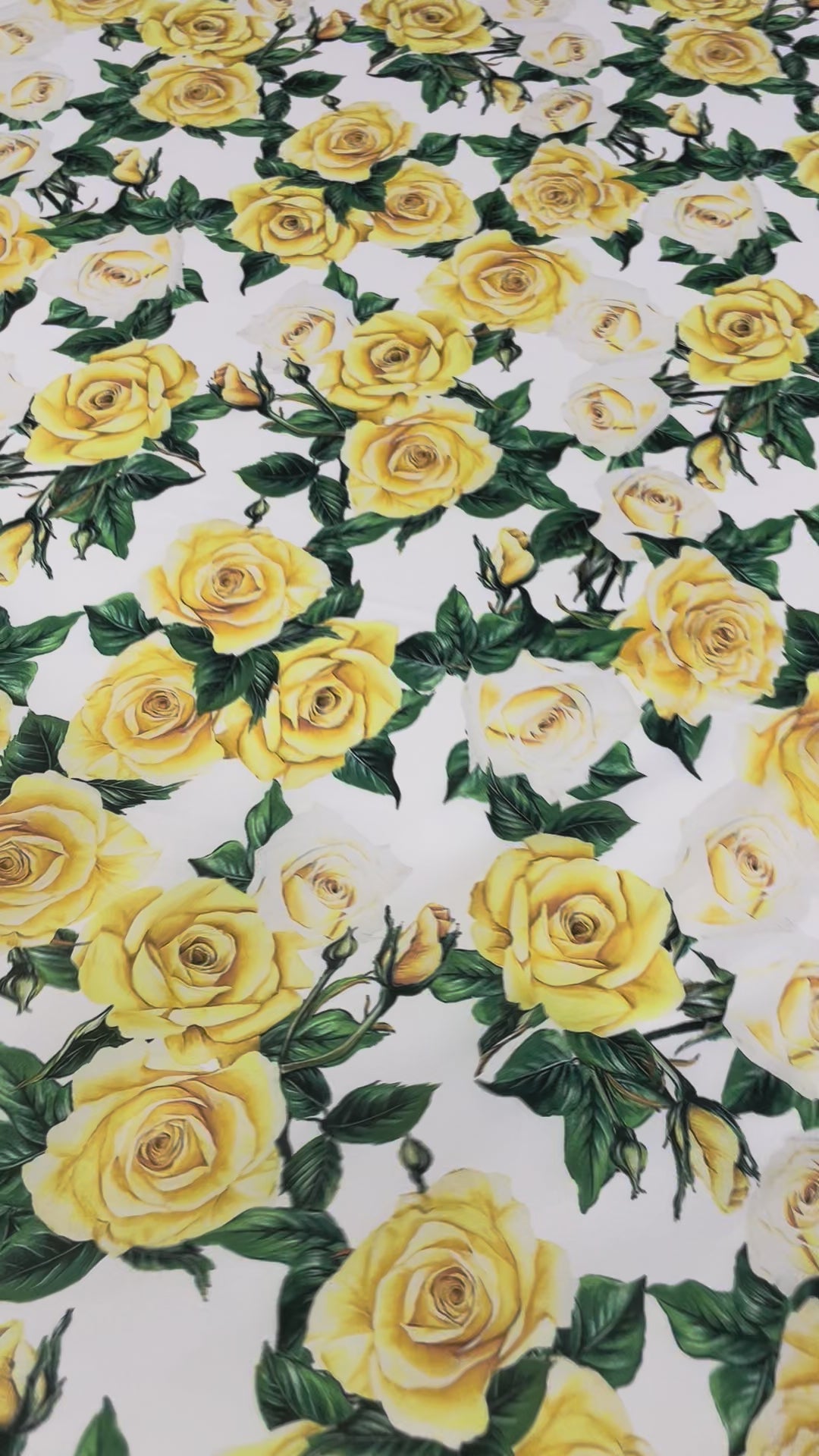 Chic white satin fabric adorned with yellow rose motifs. Perfect for elegant dresses, skirts, and creative sewing projects with a fresh floral touch.