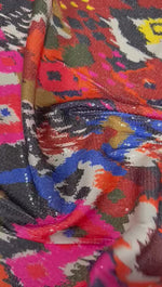 Vibrant tribal-inspired multicolour sequin fabric with a soft drape. Ideal for dresses, festival outfits, tops, skirts and creative fashion sewing projects.