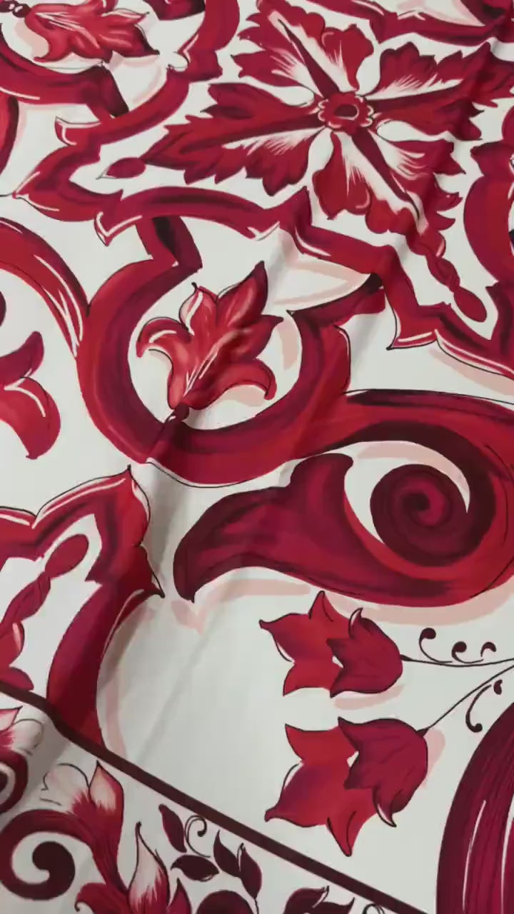 Discover our Big Majolica Pattern Fabric in vibrant magenta red, inspired by Sicilian designs. This fabric is sold by the yard and is perfect for various sewing projects. Its bold pattern and rich color make it an excellent choice for creating unique garments or home decor items.