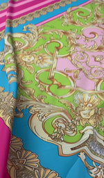 Lightweight crepe fabric with vibrant blue, pink and green baroque print. Soft drape and ideal for dresses, blouses, scarves and creative sewing projects. Sold by the metre.