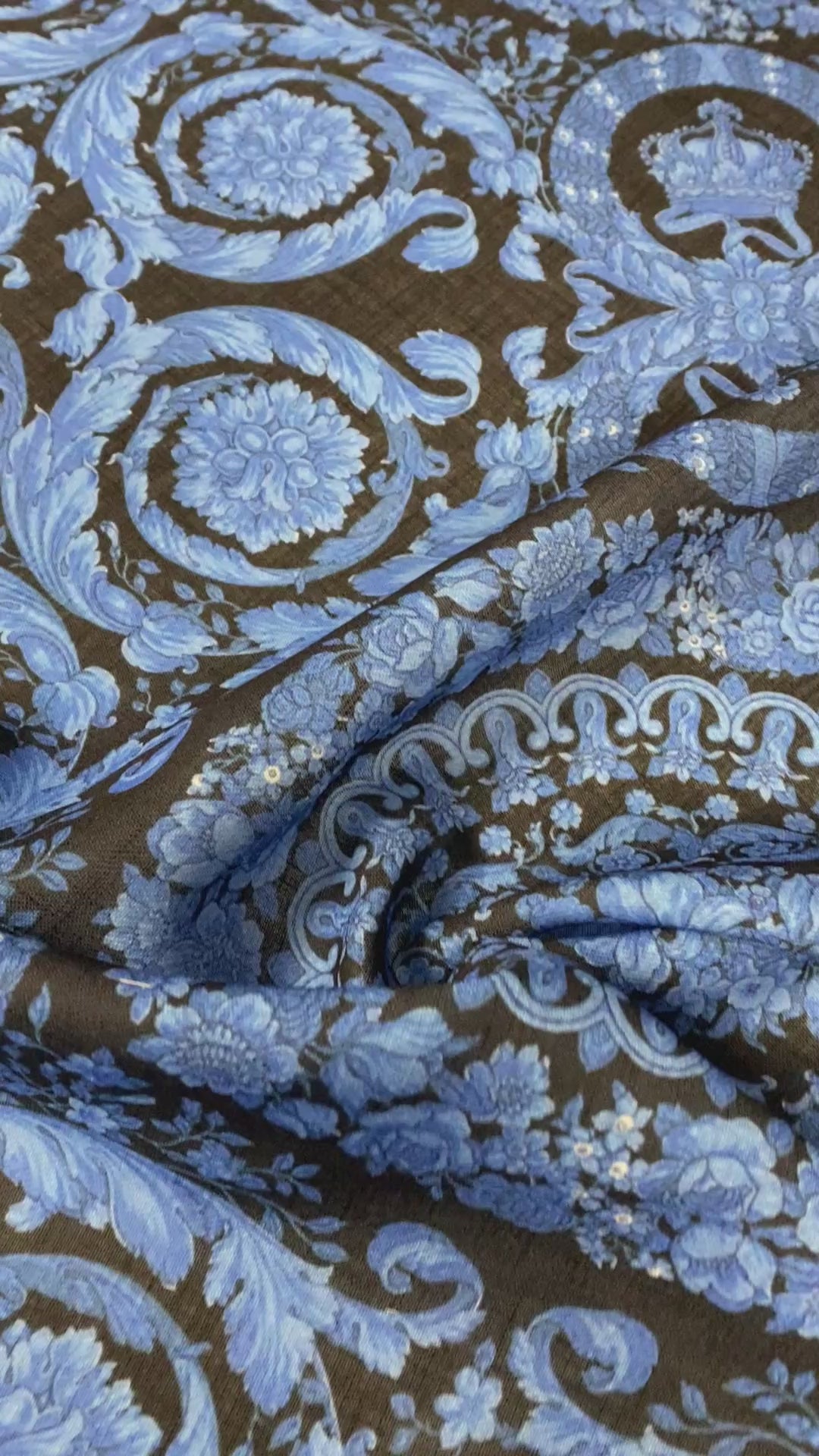 Stylish linen fabric with blue baroque floral pattern on a rich brown base. Breathable, natural and ideal for dresses, shirts, crafts and home projects. Sold by the metre.