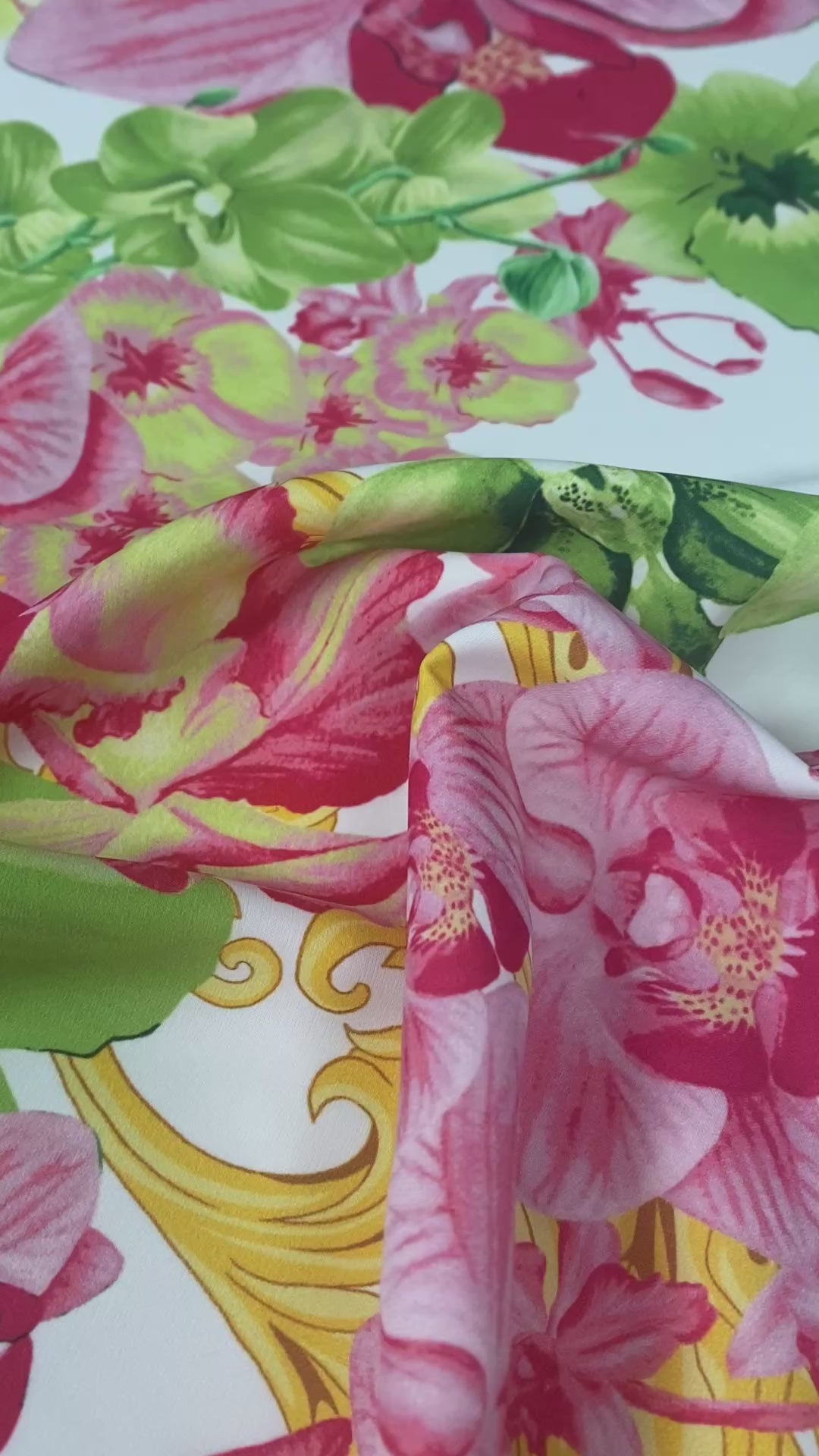 Lightweight crepe fabric with vibrant pink orchid flowers, green leaves and gold accents on a smooth white base. Soft drape and ideal for dresses, blouses and scarves. Sold by the metre.