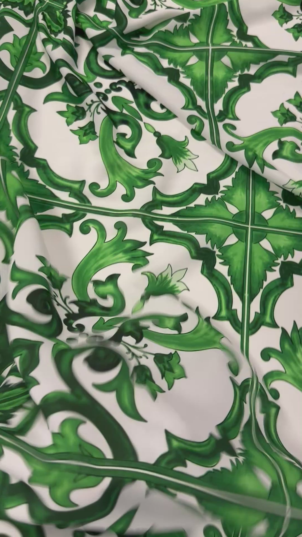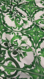 Lightweight crepe fabric with elegant green baroque-style motifs on a clean white base. Smooth drape and ideal for dresses, blouses and stylish sewing projects. Sold by the metre.