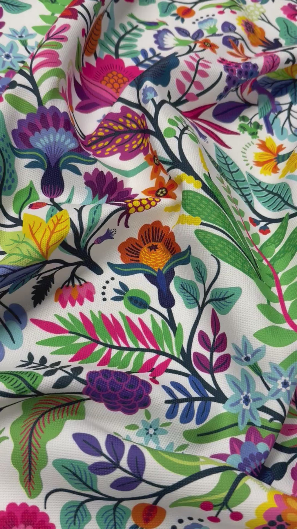 Vibrant multicolour floral upholstery fabric with detailed leaves and bold blossoms. Ideal for cushions, chairs, sofas, décor accents and creative home projects. Sold by the metre.