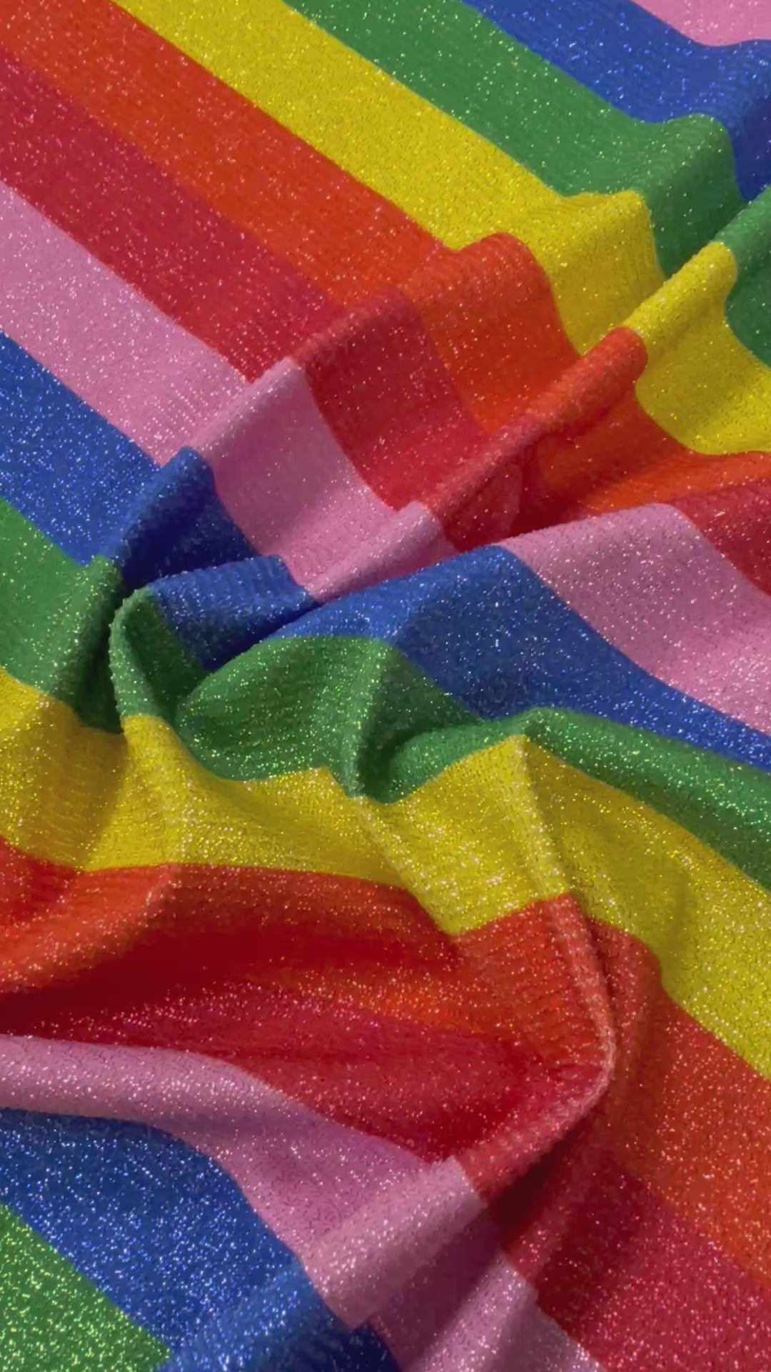 Vibrant rainbow stripe lurex fabric with a sparkling finish and soft stretch. Perfect for partywear, dance costumes, tops and creative projects. Sold by the metre.