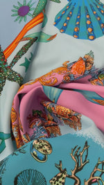 Soft-drape crepe fabric with vibrant starfish and seashell prints. Ideal for dresses, blouses and craft projects. Smooth touch, flowing look and bold marine colours.