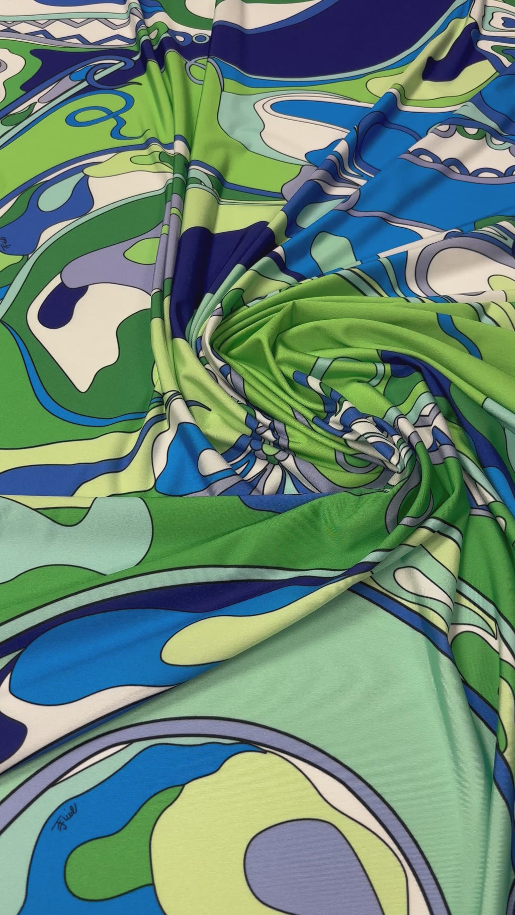 High-stretch spandex with flowing abstract swirls and a smooth, soft finish. Perfect for dresses, dancewear, swimwear and fitted garments. Sold by the metre.