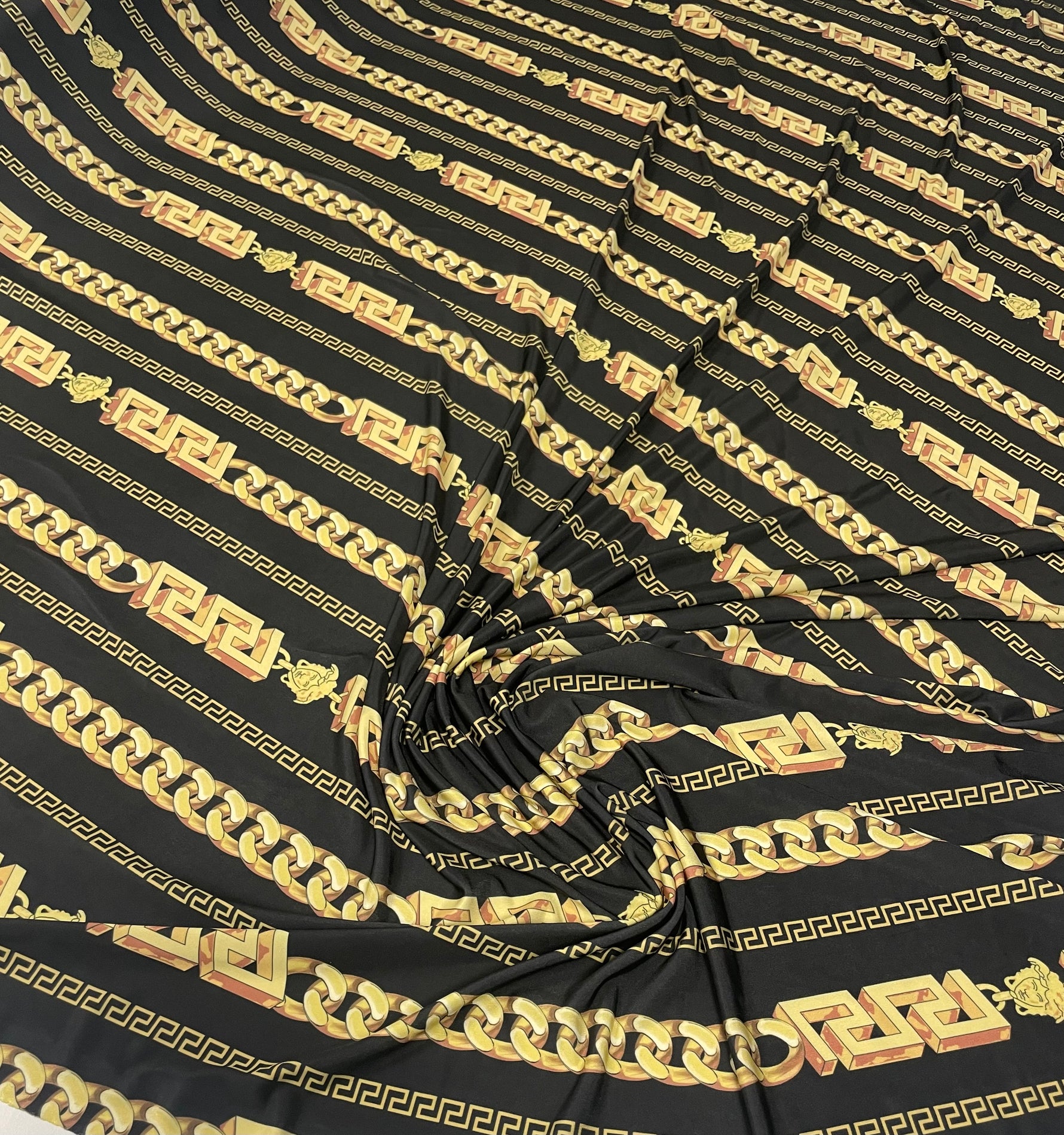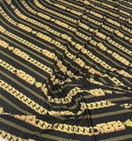 Luxurious black fabric with gold chain and geometric stripe design. Ideal for dresses, shirts, scarves and statement fashion projects.