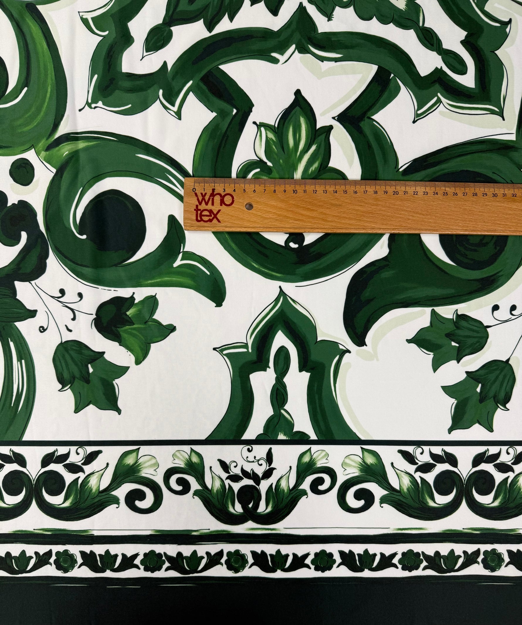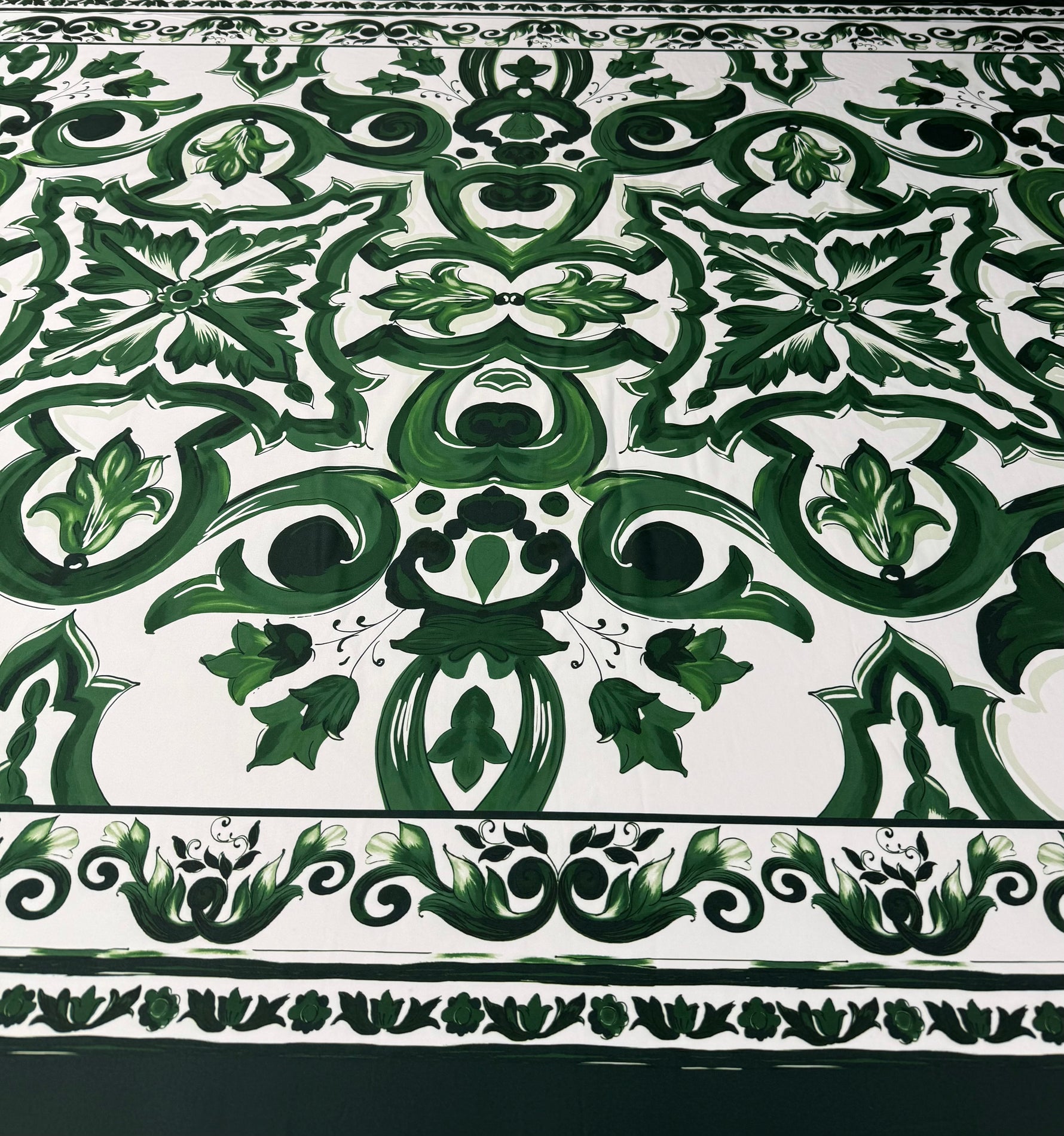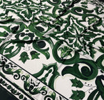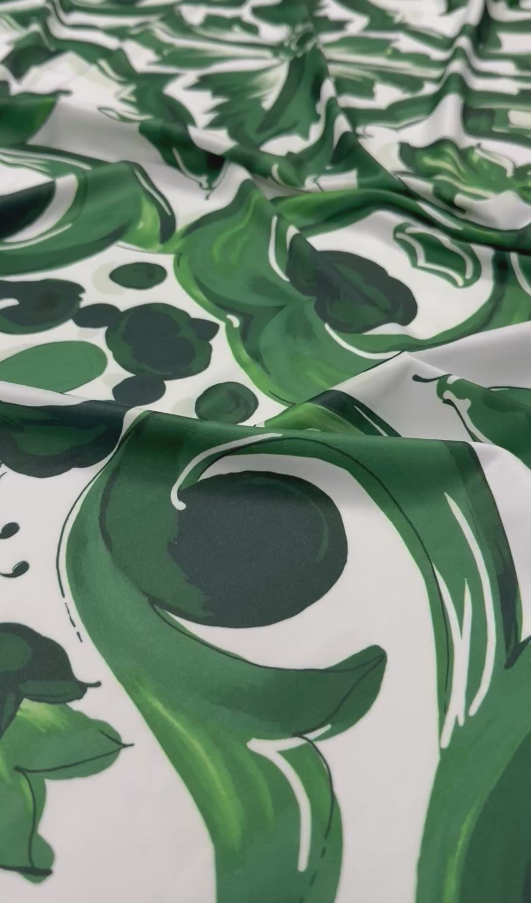 Elegant green baroque print spandex fabric with smooth texture and flexible stretch. Perfect for dresses, skirts, activewear and creative sewing projects. Sold by the Metre.