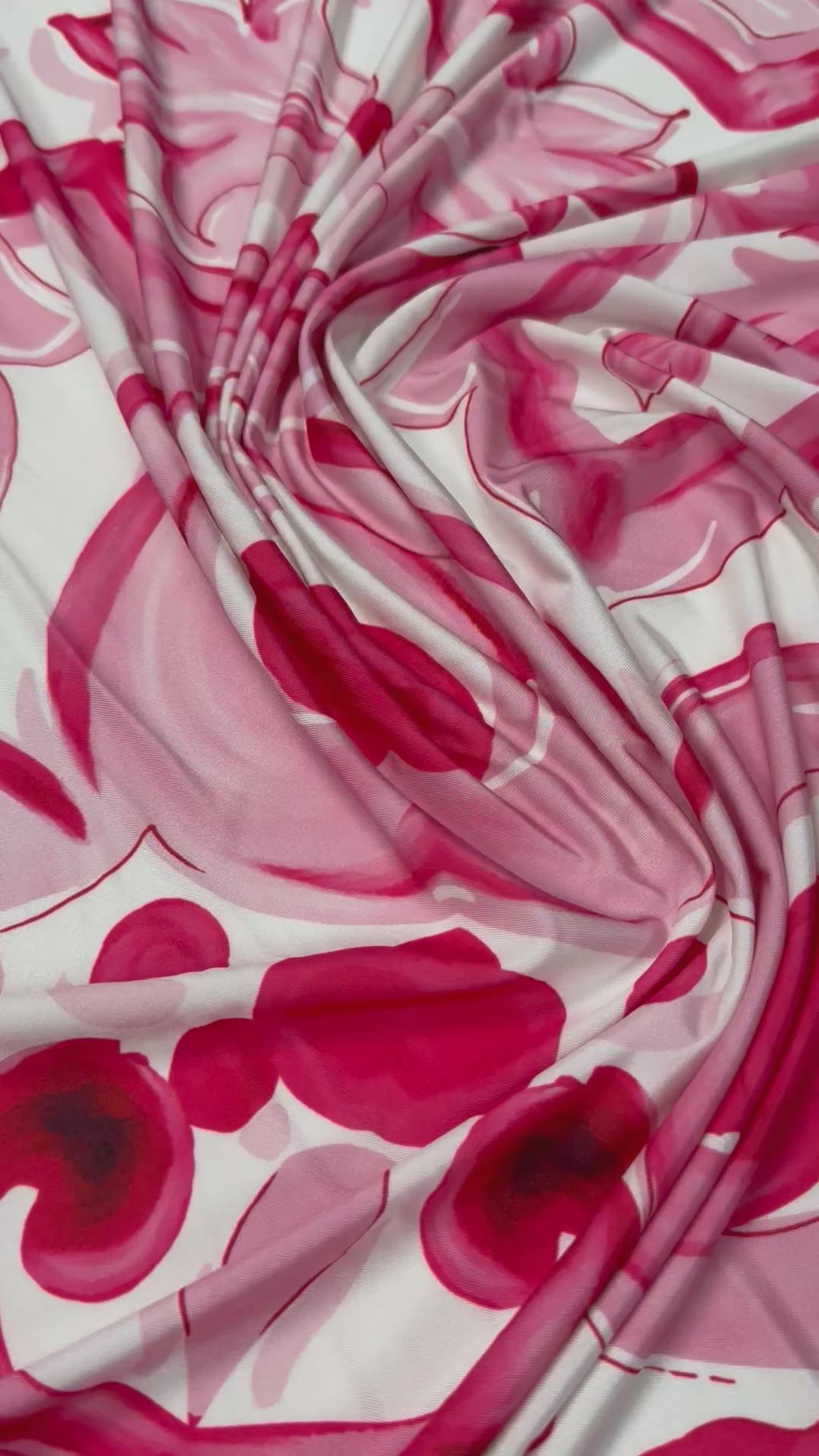 Smooth stretch spandex fabric featuring an elegant ornamental pattern. Ideal for dresses, skirts, tops, dancewear and fitted garment projects. Sold by the metre.