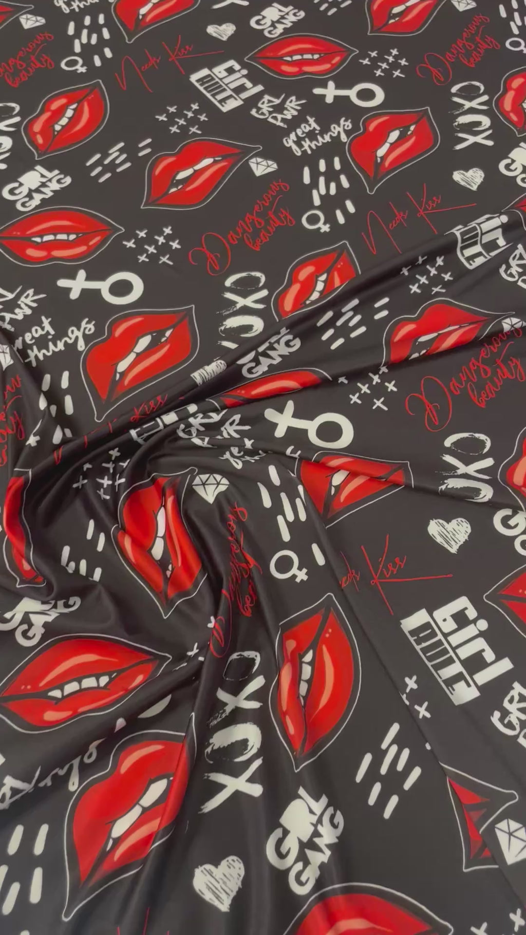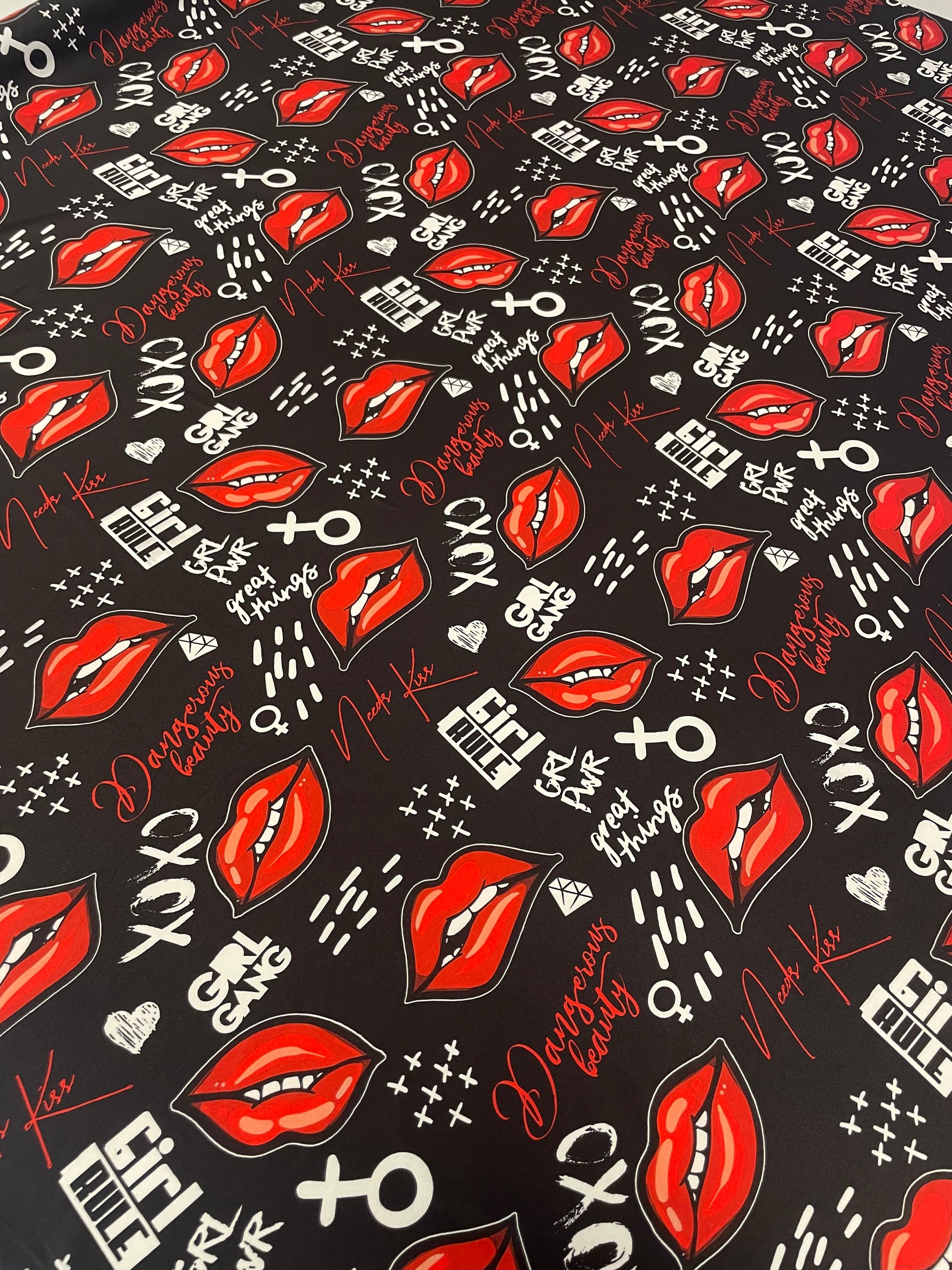 Bold black fabric with red lips and graffiti-style text print. Perfect for statement fashion, tops, dresses, and creative sewing projects.