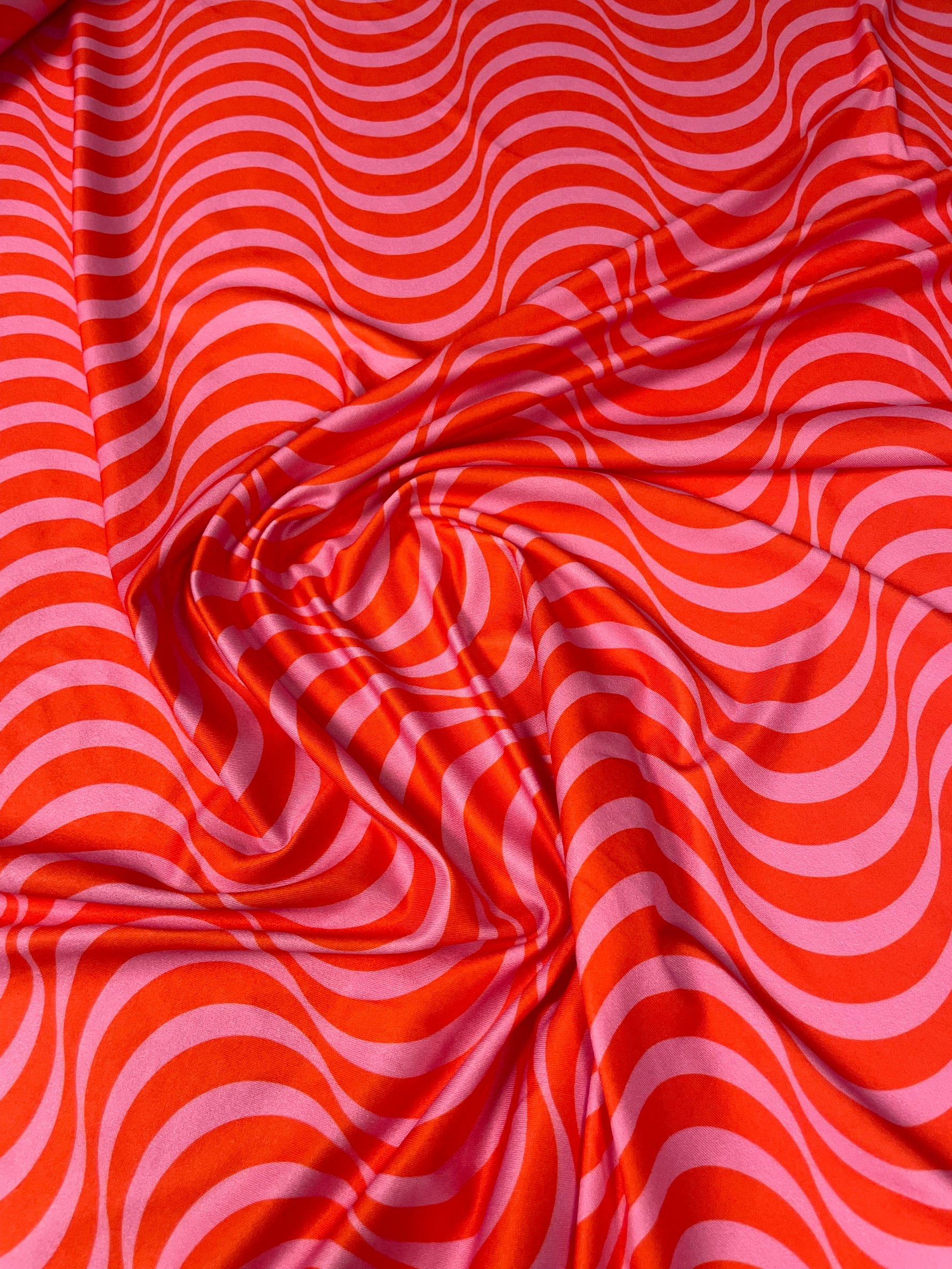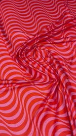 Vibrant fabric with red and pink wavy stripe design. Perfect for retro dresses, tops, skirts and bold fashion sewing projects. Sold by the metre.
