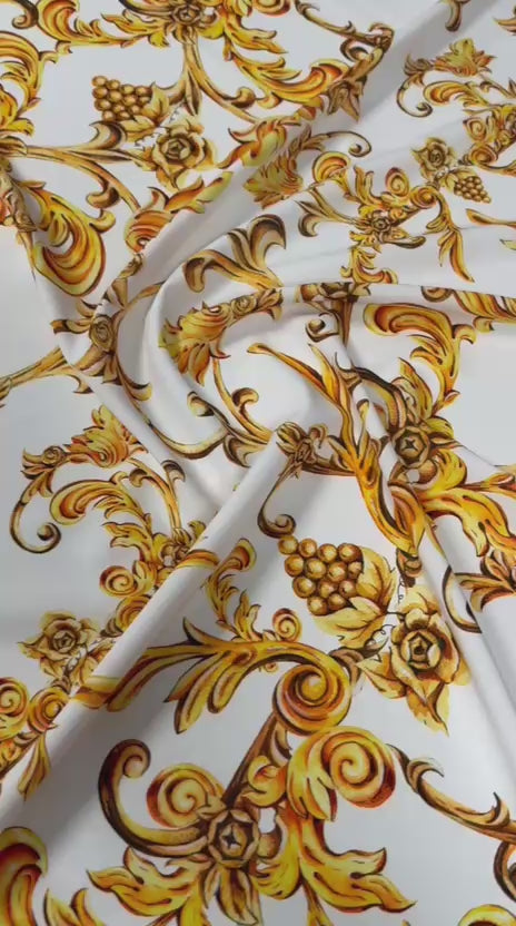 White and Gold Baroque Print Fabric – Available in Satin, Crepe, Spandex & Chiffon | By Metre