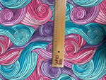 Stretch spandex fabric with vibrant abstract swirl pattern in pink, purple, and turquoise. Perfect for fashion, costumes, and creative projects.