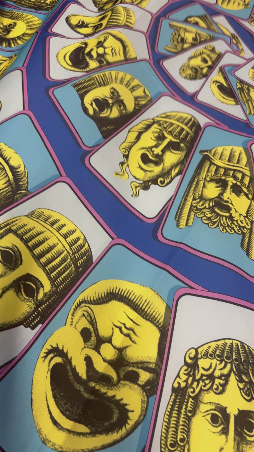 Ancient Greek Mask Print Chiffon Satin Fabric by the Metre. Sold by the metre, ideal for dressmaking, blouses, skirts and elegant fashion projects.