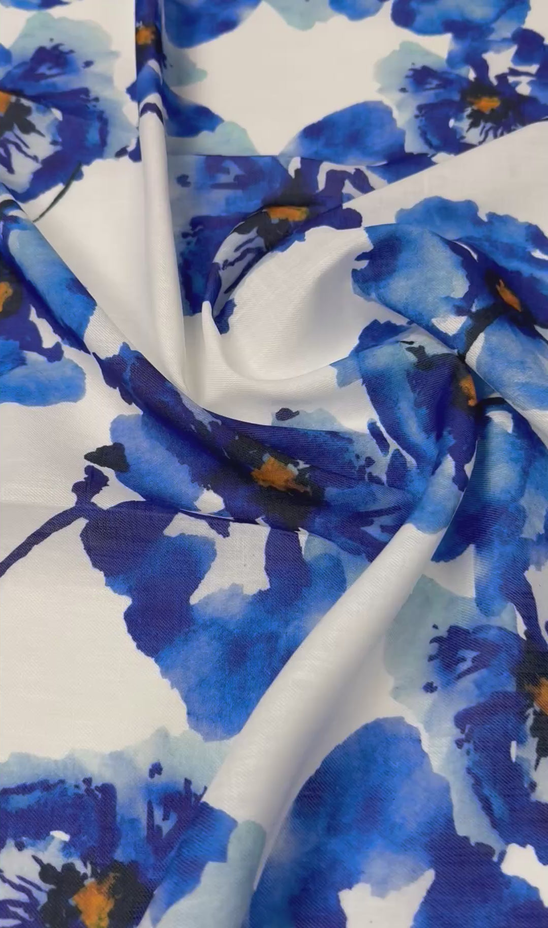 Breathable linen fabric with elegant blue watercolour floral print on a light base. Ideal for dresses, tops and relaxed home projects. Natural texture, lightweight feel and airy drape. Sold by the Metre.