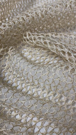 This shimmering gold fishnet mesh fabric is ideal for creating elegant crafts and designs. With a width of 150 cm, it lends itself beautifully to a variety of applications including sarongs, beachwear, body stockings, layered tops, dresses, and accessories.