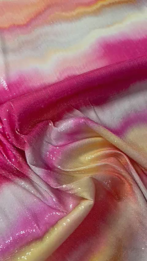 Bright pink ombre sequin fabric with a soft drape and subtle sparkle. Ideal for summer dresses, beachwear, dancewear and fun creative sewing projects.