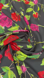 Classic red and pink rose print on soft cream background. Elegant floral fabric ideal for dresses, blouses, and decor.