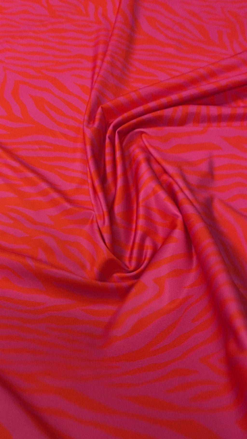 Bold zebra print spandex fabric in vibrant red and pink tones. Perfect for statement fashion, costumes, leggings, and creative DIY projects.