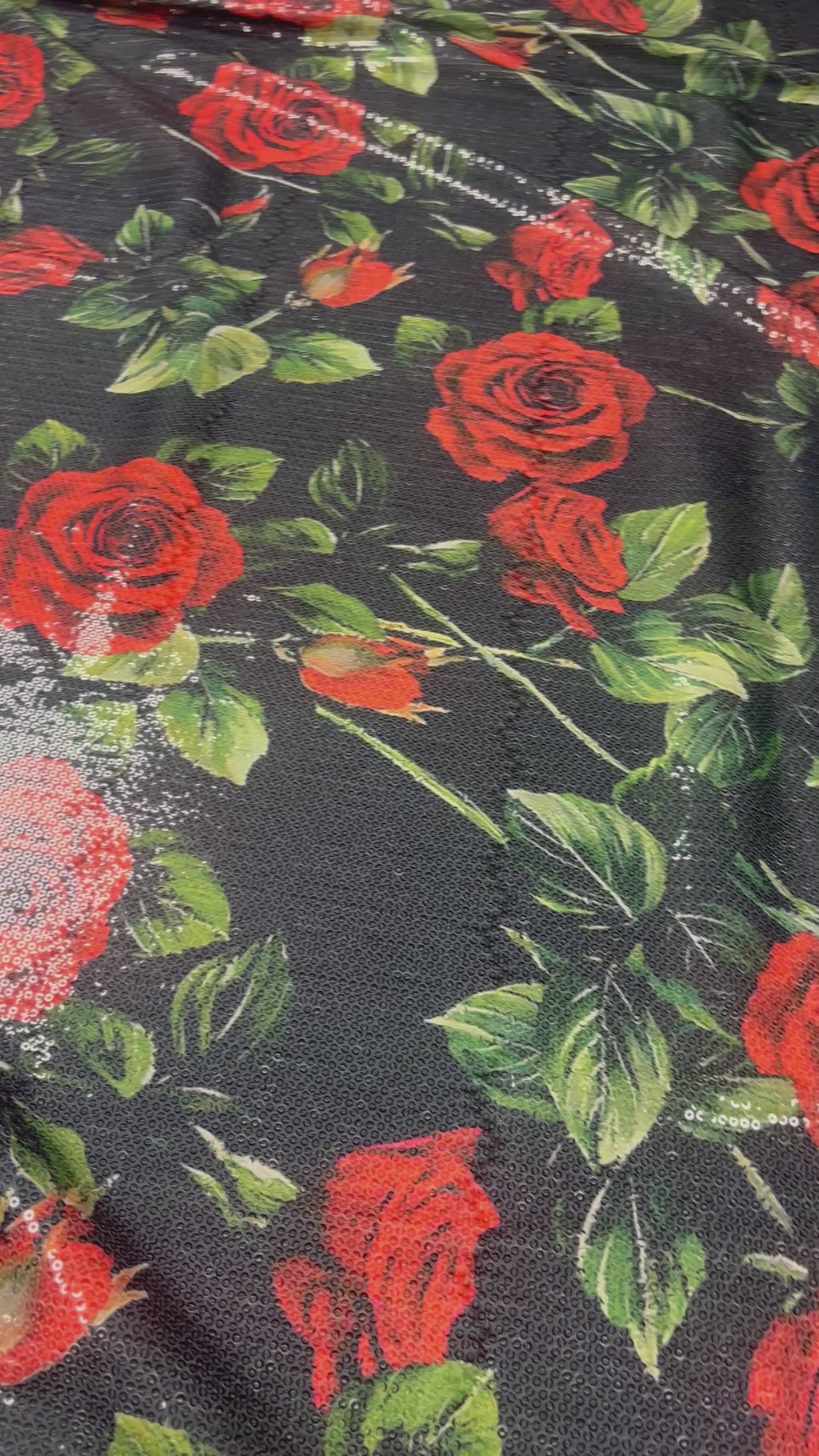 Elegant red rose print sequin fabric with a soft drape and subtle shimmer. Ideal for evening dresses, party outfits, skirts and statement fashion sewing.