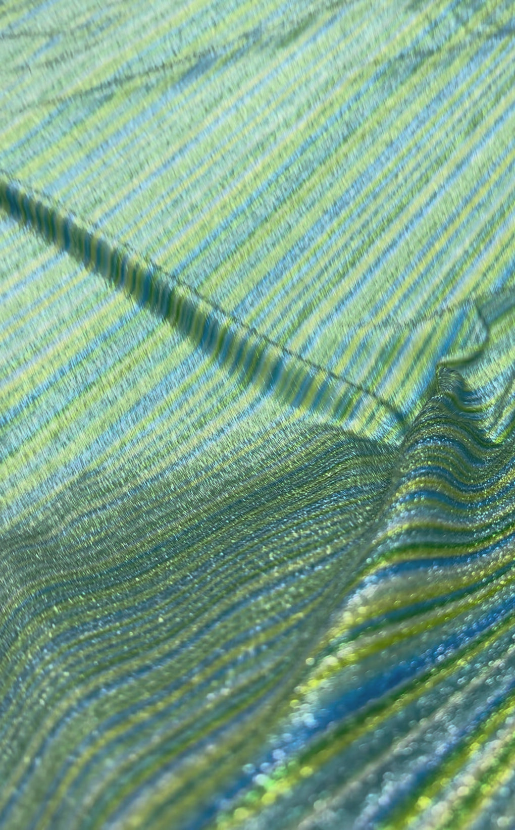 Shimmering striped lurex fabric in blue and green tones. Lightweight with a soft sparkle and fluid drape, ideal for dresses, blouses, eveningwear and creative sewing projects. Sold by the metre.